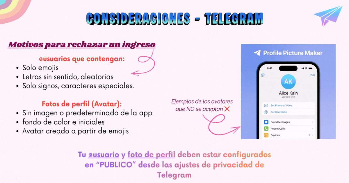 Para poder ingresar, tu perfil de Telegram debe estar correctamente configurado.